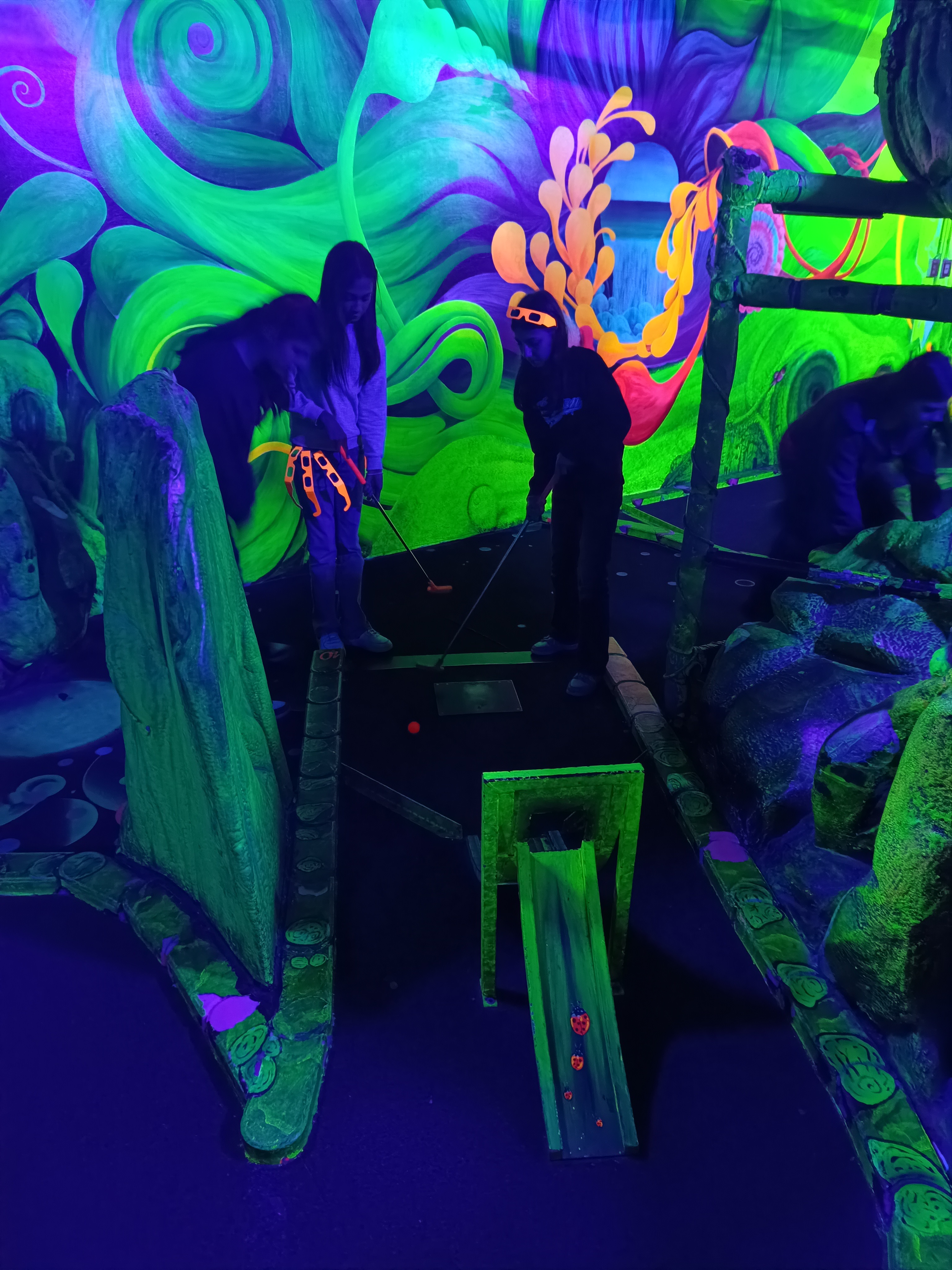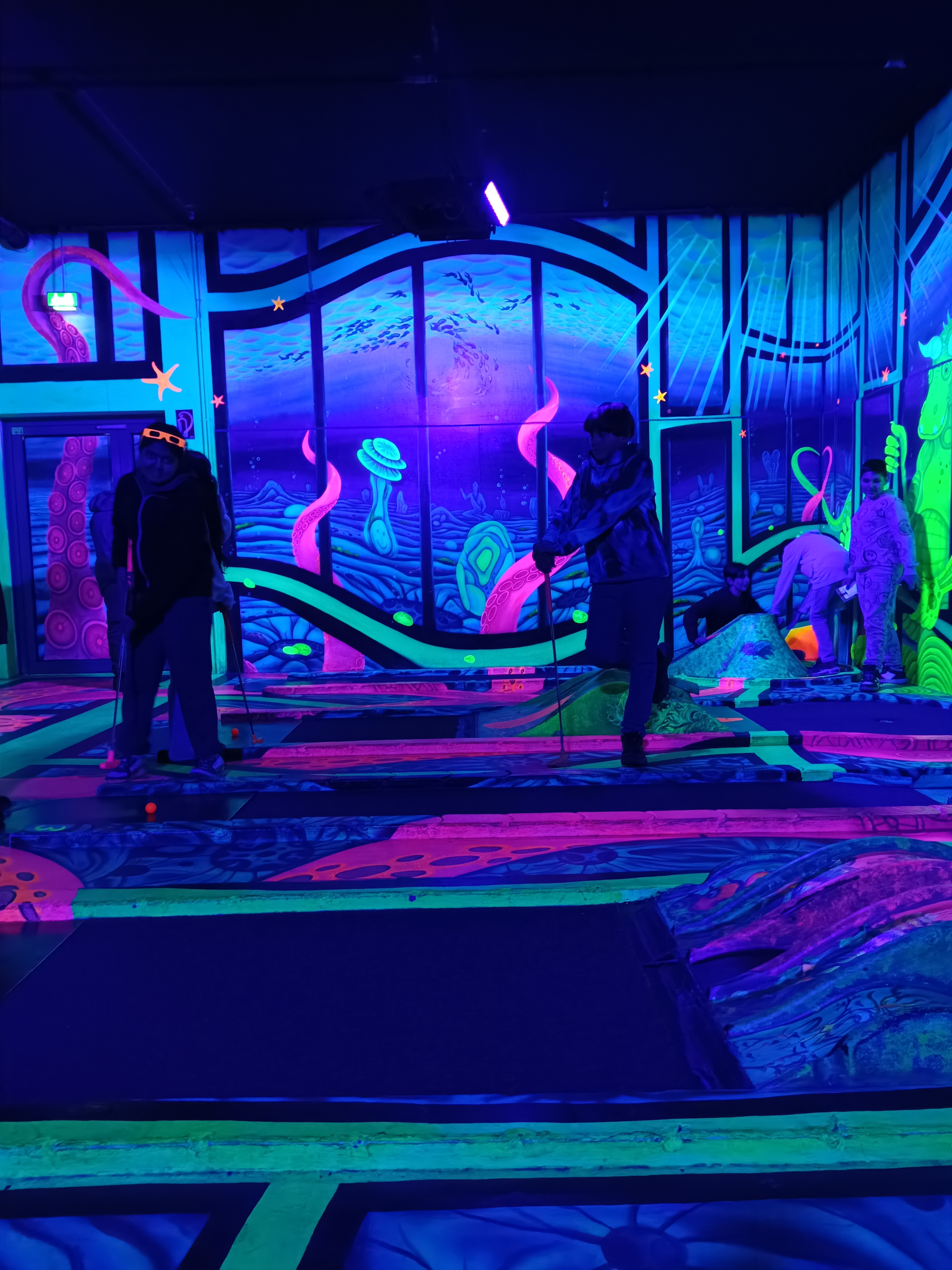 Am 22.01. haben wir, die 6b, einen Ausflug zum 3D- Scharzlichtminigolf am Tempelhofer Hafen gemacht. Es war ein langer Weg. Wir sind am U- Bahnhof Reinickendorfer Straße in die U6 gestiegen und sind 15 Stationen gefahren. Das war echt lange, doch wir haben sogar in der U- Bahn angefangen Spaß zu haben.
